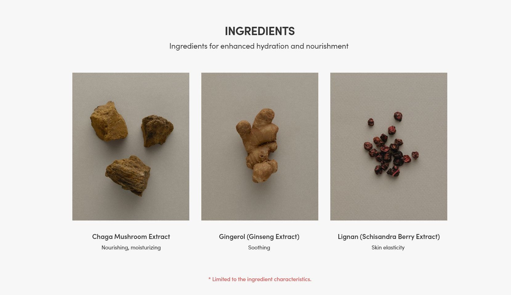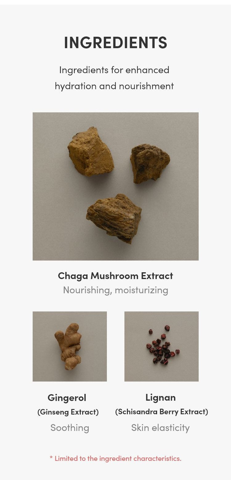 AQUA/WATER/EAU, GLYCERIN, BUTYLENE GLYCOL, 1,2-HEXANEDIOL, BETAINE, INONOTUS OBLIQUUS (MUSHROOM) EXTRACT, SODIUM CARBOMER, THEOBROMA CACAO (COCOA) SEED EXTRACT, SODIUM POLYACRYLATE, DEXTRIN, ETHYLHEXYLGLYCERIN, ADENOSINE, ZINGIBER OFFICINALE (GINGER) ROOT EXTRACT, SCHISANDRA CHINENSIS FRUIT EXTRACT, TOCOPHEROL